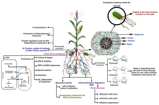 Representation of possible plant–microbe interactions favouring plant growth and/or biocontrol of phytopathogens by streptomycetes as rhizosphere competent microorganisms and/or endophytes (adapted from [57]).