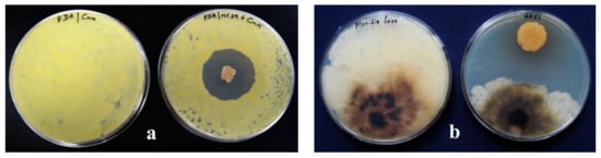 In vitro biocontrol activity of Streptomyces spp.: (a) antimicrobial activity against Clavibacter michiganensis subsp. michiganensis, the causal agent of the tomato bacterial canker and (b) antifungal activity against Monilinia laxa, the causal agent of the brown rot of stone fruits.