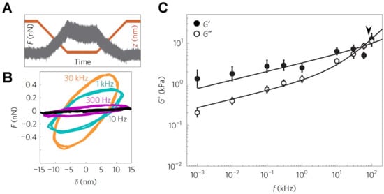 Measurement of the visco-elasticity of living cells over a broad range of application frequencies. (A) Typical force–time trace for the case with a 1 kHz oscillation obtained on a 3T3 fibroblast cell. Upon attaining an indentation of 250 nm, there is a small reduction in force, from a maximum of 0.5 nN, together with the superimposed oscillation; (B) The force–indentation cycles determined from the contact region of force curves exhibit significant differences at different oscillation frequencies, notably in the slope and degree of hysteresis in the cycle; (C) Frequency dependence of the storage modulus, G′, and loss modulus, G″, from the 3T3 cells. The transition frequency, separating the two regimes, is depicted by the arrowhead. This image is adapted from Rigato et al. published by Nature (2017) [137].