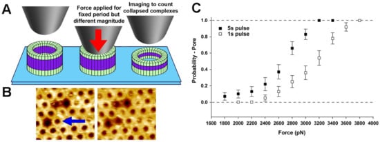 Single molecule CFS characterization of the pre-pore to pore transition in the pore-forming toxin, PFO. (A) Schematic diagram of the experiment, whereby a constant force in applied to pre-pore trapped complexes for a specific length of time (1 s or 5 s), followed by imaging at much lower forces to determine if the force was sufficient to catalyze the vertical collapse of the complex to the pore height; (B) Typical atomic force microscopy (AFM) images before (left) and after (right) the application of ~110 pN/monomer (~4000 pN) to a single pre-pore complex (blue arrow) Image size is 200 × 220 nm2; (C) Force and time dependence of the pre-pore to pore height collapse, from which details of the energy landscape associated with this transition can be directly obtained. This image is adapted from Czajkowsky et al. published by eLife (2015) [48].