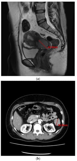 Pelvic magnetic resonance imaging indicated a tumor in the endocervix measuring 42 × 32 × 38 mm (Figure 1a), and a tumor in the transverse colon measuring 36 mm in the largest diameter (Figure 1b). It did not show peritonitis carcinomatosa, ascites, dissemination nodules, or metastasis to other organs. Contrast-enhanced computed tomography (CT) showed no lymphadenopathy. These findings suggested colorectal metastasis from cervical cancer or double cancer (cervical and colorectal cancer). Positron emission tomography-CT showed abnormal 18F-fluorodeoxyglucose uptake in the cervix and colorectum.