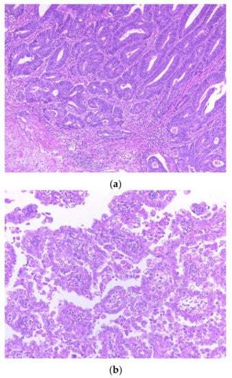 Few case reports have described Lynch-related endocervical adenocarcinoma, the typical cervical cancer observed in women believed or shown to have MMR gene mutations [,,]. One case reported a germline mutation in MSH2, in which the tumor was immunohistochemically deficient for MSH2 and MSH6 with high levels of MSI [], and another reported the Muir–Torre variant of Lynch syndrome, where individuals have defects in either MSH2 or MLH1 [,]. In the first case, there was no mention of tumor morphology [], whereas in the second, the neoplasm was described as an adenocarcinoma with focal serous papillary features []. In the second case, there was no mention of testing the tumor for MSI or conducting immunohistochemistry for MMR proteins. A third report described a case of gastric-type adenocarcinoma of the cervix in a patient with Lynch syndrome secondary to a germline mutation in the MSH6 MMR gene. However, MSI analysis was not performed [].