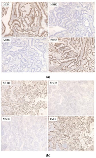 - Senter, L.; Clendenning, M.; Sotamaa, K.; Hampel, H.; Green, J.; Potter, J.D.; Lindblom, A.; Lagerstedt, K.; Thibodeau, S.N.; Lindor, N.M.; et al. The clinical phenotype of Lynch syndrome due to germ-line PMS2 mutations. Gastroenterology 2008, 135, 419–428. [Google Scholar] [CrossRef] [PubMed]