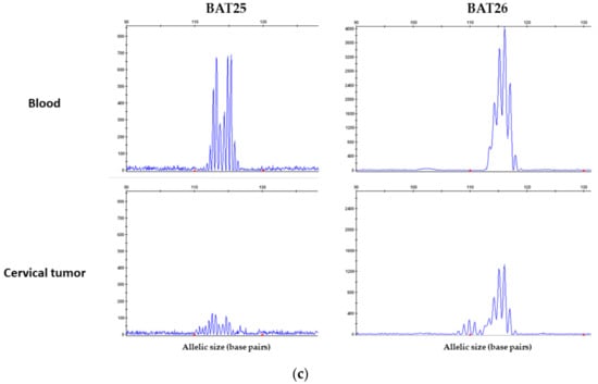 For MSI analysis, genomic DNA was extracted from fresh tissue from the cervical tumor and blood samples using the QIAamp DNA Micro Kit (Qiagen, Valencia, CA, USA) according to the manufacturer’s standard protocol. We performed MSI analysis using the polymerase chain reaction (PCR) with eight microsatellite markers (BAT25, BAT26, D2S123, D5S346, D17S250, NR21, MONO27, and NR2). MSI analysis in the cervical tumor and blood using the National Cancer Institute panel revealed that the tumor had high MSI. Particularly, the cervical tumor showed instability in two microsatellite repeats (Figure 3c), which is considered MSI-high.
