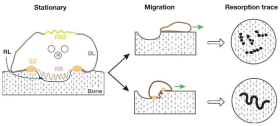 Polarization of osteoclast during bone resorption. The scheme on the left shows a cross section of the resorbing osteoclast in the stationary mode. The polarization of an osteoclast compartmentalizes its plasma membrane on the bone []. The resorption lacune is the space enclosed within the sealing zone, the ruffled border membrane, and the bone. The stationary resorbing osteoclast transits into one of the two migratory modes. The osteoclast stops bone resorption and migrates on bone (upper panel in the middle), or continues bone resorption in the migratory mode (lower panel in the middle). Green arrows indicate the direction of movement. The former mode of osteoclasts forms pit-type resorption traces (upper panel in the right), while the latter produces trail- or trench-type resorption traces (lower panel in the right) [,]. The right panels show the resorption traces in a bird’s eye view. BL, basolateral membrane; FSD, functional secretory domain; N, nucleus; RB, ruffled border membrane; RL, resorption lacune; SZ, sealing zone.