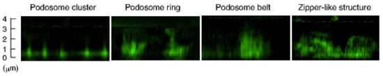 - Murphy, D.A.; Courtneidge, S.A. The “ins” and “outs” of podosomes and invadopodia: Characteristics, formation and function. Nat. Rev. Mol. Cell Biol. 2011, 12, 413–426. [Google Scholar] [CrossRef] [PubMed]