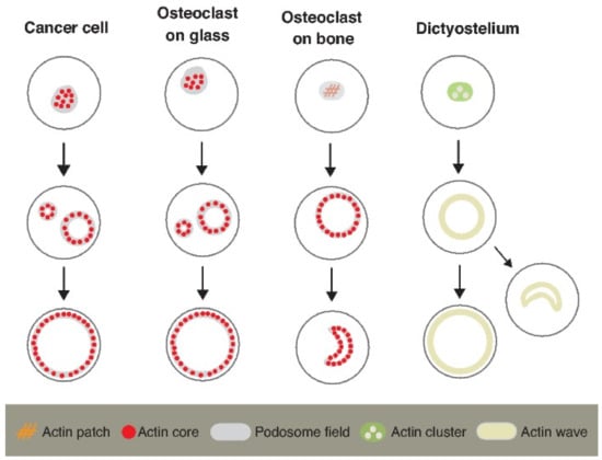 On the other hand, the formation of the sealing zone on apatite–collagen-coated glass [] and on dentin [] is preceded by the appearance of the actin patch, an uncharacterized actin cluster. In osteoclasts on glass, the podosome cluster develops into the podosome ring and the podosome belt []. A similar pattern transition is also observed in the invadopodia of Rous sarcoma virus (RSV)-transformed baby hamster kidney (BHK) cells []. The assembly of actin in osteoclasts and transformed cells is highly dynamic and often causes fusion and fission. Because these behaviors resemble those of the actin wave in Dictyostelium, we proposed that the transition of actin assembly in osteoclasts is caused by the actin flow in the podosome field [,].