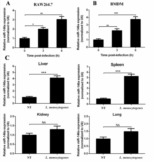 L. monocytogenes infection induced miR-146a expression both in vitro and in vivo. RAW264.7 cells (A) or Murine bone marrow-derive macrophages (BMDMs) (B) were infected with L. monocytogenes 10403S at a multiplicity of infection (MOI) of 20 for the indicated time. Different organs were collected from L. monocytogenes-infected or PBS-treated mice at day 3 post-infection. MiR-146a was measured by real-time PCR, with a total of six mice per group (C). Data are shown as the mean ± s.e.m. of three independent experiments. * p < 0.05; ** p < 0.01; *** p < 0.001; NS, no significance.