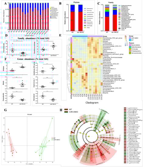MiR-146a alters the gut microbiota in mice. (A) Bacterial-taxon-based analysis at the phylum level in the stool samples of WT (n = 8) and miR-146a KO (n = 8) mice; (B,C) gut microbiota structures are shown in histograms at the phylum and family levels in WT and miR-146a KO mice; (D,F) richness represented as the proportions of operational taxonomic units (OTUs) classified at the family and genus rank; (E) heatmap of relative abundances of bacterial taxa at the genus level; (G) principal component analysis (PCA) plot based on bacterial 16S rRNA gene sequence abundance in fecal content. Axes correspond to principal components 1 (x axis) and 2 (y axis); (H) analysis of gut microbiota at different taxonomic levels and key microbiota that contribute to the structure of gut microbiota in WT (in red) and miR-146a KO mice (in blue).