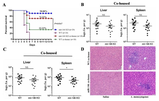 Because miR-146a KO mice had some alterations in gut microbiota composition as compared to WT controls, we took advantage of the transmissible nature of the gut microbiota to investigate whether the susceptibility to L. monocytogenes infection could be increased in miR-146a KO mice by co-housing them with WT mice. After four weeks of co-housing, we analyzed the co-housing gut microbiota by qPCR. Our 16S rRNA gene sequencing analyses revealed that there was a significantly difference in gut microbiota between separately housed WT and miR-146a KO mice, including Proteobacteria, Prevotellaceae, and Alistipes (Figure 4B,D,F). Interestingly, co-housing WT and miR-146a KO mice equilibrated the relative abundance of Proteobacteria, Prevotellaceae, and Alistipes in WT and miR-146a KO mice (Figure S1). These results indicated that co-housing could promote the exchange of gut microbiota between WT and miR-146a KO mice. The co-housed mice were infected intraperitoneally (i.p.) with a lethal dose of 106 CFU of L. monocytogenes. We found that WT mice co-housed with miR-146a KO mice (33.33.00%, 6/18) significantly increased the survival when compared with separately housed WT mice (0.00%, 0/24) (Figure 5A), while the survival rate of co-housed miR-146a KO mice (72.22%, 13/18) slightly decreased in comparison with separately housed miR-146a KO mice (90.00%, 18/20) (Figure 5A).