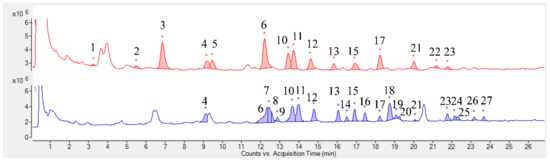 | Peak | [M + H]+ | [M − H]− | Compounds | Peak | [M + H]+ | [M − H]− | Compounds | Peak | [M + H]+ | [M − H]− | Compounds |