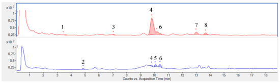 | 8 | 665.1806 | Patuletin-O-deoxy-hexoside-O-acetyl-deoxy-hexoside | 17 | 709.1967 | 707.1883 | Patuletin-di-O-acetyl-deoxy-hexoside | 26 | 691.1957 | Eupafolin-di-O-acetyl-deoxy-hexoside | ||