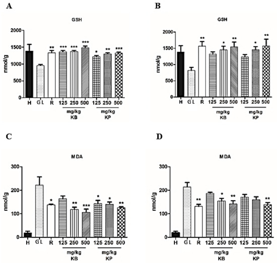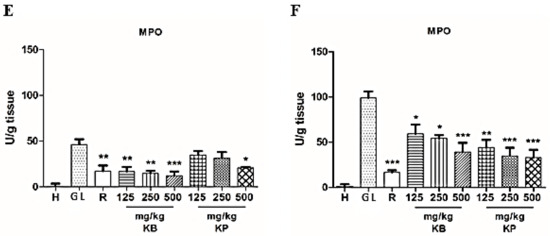 2.4. Effect of Kalanchoe brasiliensis and Kalanchoe pinnata Leaf Juices on Glutathione (GSH) and Malondialdehyde (MDA) Levels and Myeloperoxidase (MPO) Activity