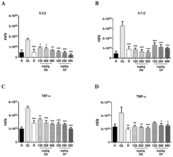 2.5. Effect of Kalanchoe brasiliensis and Kalanchoe pinnata Leaf Juice Pre-Treatment on Interleukin-1β (IL-1β) and Tumor Necrosis Factor-α (TNF-α) Levels