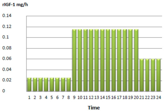 The initial treatment consisted of rhIGF-I application via BID injection. The initial dosage consisted of 2 × 200 μg mecasermin, which was escalated to a final dose of 2 × 1 mg/day, corresponding to a dosage of 0.5 mg/kg body weight per day over a period of one week. However, since we found no relevant effect on diurnal glucose control, and rather, an aggravation of fasting hypoglycemia during the night, we decided to test continuous subcutaneous mecasermin infusion using an insulin pump. Mecasermin was diluted with physiological NaCl infusion solution, with a final rhIGF-I dosage of 1.8 mg/day (see Figure 1).