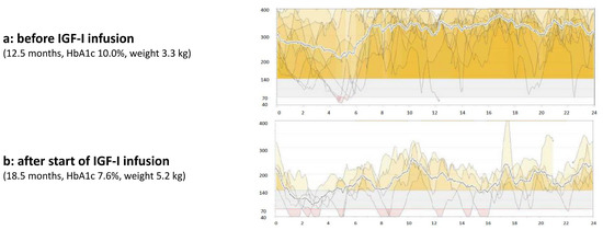 Glucose profile using a continuous glucose monitoring system (CGMS) before (a) and after (b) initiation of continuous subcutaneous mecasermin infusion via an insulin pump.