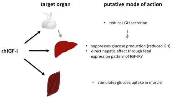 Because of its previously reported effect on glucose homeostasis, rhIGF-I has been postulated as a potential therapeutic option in SIR syndromes. The IGF-I gene is a major target of growth hormone (GH) and an important mediator of GH-stimulated growth, but exerts different effects on carbohydrate, lipid and protein metabolism compared to GH. IGF-I stimulates a reduction in blood glucose and circulating insulin levels and therefore, can cause hypoglycaemia [70]. This effect is in part mediated through IGF-I’s structural similarity with insulin and its affinity to the insulin and IGF-I receptors, which share common post-receptor signaling pathways [19,20]. In vitro studies using adenoviral IGF-I gene transfer into ß-cells have shown the promotion of ß-cell survival and proliferation [71]. Furthermore, islet cell exposure towards IGF-I seems to sustain or increase insulin synthesis [72]. Therefore, an increase in the circulating insulin concentration under conditions where a residual insulin effect is maintained, either through insulin/IGF-hybrid receptors or through mutated insulin receptors with residual IR function, might lead to an improvement in glucose homeostasis. In SIR, the effects of rhIGF-I on glucose homeostasis are thought to occur mainly through increased glucose uptake into peripheral tissues (e.g., muscle) and a reduction in hepatic glucose production (see Figure 3).