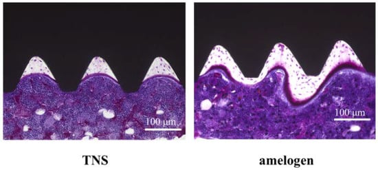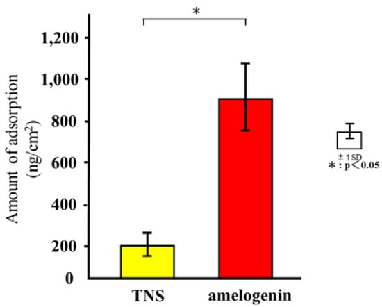 In addition, amelogenin, the predominant protein component of secretory stage tooth enamel, has been used to fabricate biomimetic coatings on titanium and bioglass surfaces [,,]. Amelogenin constitutes a matrix protein secreted by ameloblasts that comprises 95% of the mineralizable matrix in the developing enamel. In turn, an enamel matrix derivative (EMD) is a commercial product used for regeneration of periodontal bony defects in patients with periodontal disease. To date, EMD represents the only agent that can restore periodontal defects by regenerating cementum, periodontal ligament, and alveolar bone [,,]. Notably, recent studies have shown that purified amelogenin could affect regeneration of the tooth-supporting tissues around implant material [,]. We, therefore, hypothesized that an amelogenin coating on a titanium surface would promote osteoblastic differentiation and extracellular matrix production. However, the binding strength between titanium and amelogenin remained a concern. Thus, we further considered that a nano-modified titanium surface exhibiting a strong binding ability with protein could be used as an experimental material. Specifically, as it was inferred that the effects on the behavior of various cells manifested by TNS [,] derived from changes in the mechanical and chemical structure of the titanium surface, we considered that adsorption of proteins such as amelogenin would be very high on the TNS-modified titanium surface.