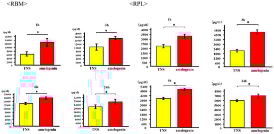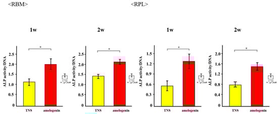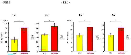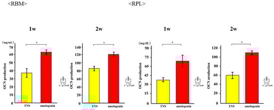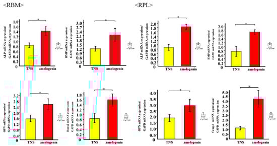 Some studies show that enamel matrix proteins such as amelogenin induce cementum formation and achieve periodontium repair in rats, monkeys, and humans [,,]. Amelogenin stimulates RPL cells to induce periodontium regeneration and the formation of new cementum, bone, and dentin in clinical trials. In the present study, amelogenin coating on a TNS-modified titanium surface promoted the upregulation of RPL cell attachment and proliferation, as well as bone differentiation. In particular, CEMP-1 may play a role as a local regulator of cementoblast differentiation and cementum-matrix mineralization. This protein was shown to be expressed by cementoblasts and progenitor cells localized in the RPL cells. To confirm the formation of cementum, which constitutes one of the periodontal tissues, ALP activity, Runx2, and BMP served as useful key factors at the in vitro level. Our experimental results suggested that amelogenin induced not only new bone but also the formation of cementum.