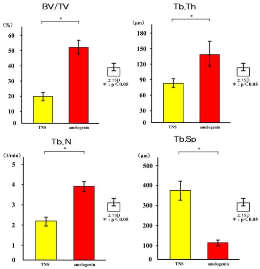 The reconstructed three-dimensional micro-computed tomography (CT) images from transverse slices of rat femurs including implants are shown in Figure 12. Both the test and control surface promoted new bone formation around the implants. More trabecular microarchitecture was observed in the vicinity of the amelogenin-coated TNS-modified titanium surface than of the TNS modified titanium surface. Quantitative evaluation of the trabecular bone within the region of interest (ROI) is shown in Figure 13. Bone volume (BV)/ tissue volume (TV), Tb.N, and Tb.Th were significantly higher in the test implant group compared to the control implant group (p < 0.05). Conversely, Tb.Sp exhibited a significantly lower value in the test group compared with the control group.