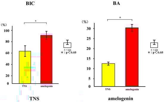 The rat femur model in the present study was employed to evaluate the bone tissue response to implants via only trabecular bone, which is more relevant to clinical situations. The bone formation activity around the amelogenin-coated TNS-modified titanium implant was continuous and substantial up to week 8 in the healing process. In contrast, bone formation activity barely increased around the TNS-modified implant without amelogenin. Healing at this time point is considered to be in the final stage of wound healing in rat models [,], whereas the degree of bone–implant contact is affected by the early bone response to implant surface. In the present study, the bone-implant contact pattern for the amelogenin-coated TNS-modified titanium was enhanced compared with that of the TNS-modified implants alone. Emdogain®-provided amelogenin may exert a survival and a differentiative signal on RBM cells, an effect which fits well with its ascribed role in promoting early stages of in vivo bone formation as reported by Kawana et al. []. This study supports our present research, confirming that an amelogenin-coated TNS-modified titanium surface promotes bone differentiation around titanium implants not only at the in vitro level but also in vivo. Further studies are necessary to analyze the mechanism of induction utilized by the amelogenin-coated TNS-modified titanium surface.