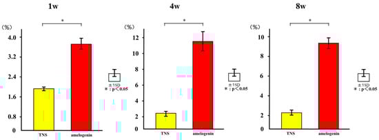 The histological sections were also observed using confocal laser scanning microscopy for dynamic histomorphometry according to fluorescence labeling (Figure 16). We observed colored linear signals, representing oxytetracycline hydrochloride (1 week), alizarin red S (4 weeks), and calcein (8 weeks) in new bone around the implants. The increases in the distance between the implant surface and labeled bone at different time points were significantly higher in the test implants than in the control implants. Quantitatively, the amelogenin-coated TNS-modified titanium implants exhibited the best effects with regard to increasing the percentage of labeled bone area (%LBA) compared with the control groups (p < 0.05) (Figure 17).