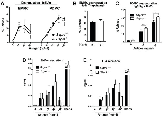 In summary, our studies demonstrate that S1P4 is expressed in mast cells, but mast cell-intrinsic expression is dispensable for most IgE-mediated responses in vitro. We, however, unveil a modulatory role for S1P4 in the exacerbation of innate type mast cell degranulation by IL-33. This observation may be of importance and requires further study, especially in the context of allergic inflammation where IL-33 is key. S1P receptor expression and signaling is clearly important for allergic mast cell-mediated responses in vivo and studies employing mice that harbor conditional or tissue-specific S1pr4 deletion will be critical for further dissecting the role of this molecule and its biology in the context of complex immunologic responses.