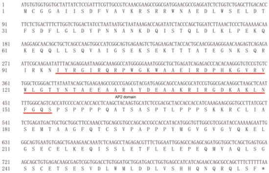 The conserved APETALA2 (AP2) DNA binding domain in the ERF72 protein. Conserved AP2 domain is indicated by underline. The stop code marks as *.