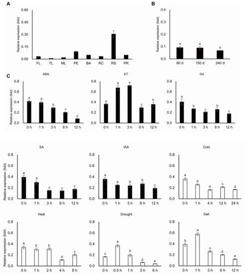Transcription profiles of MeERF72. (A) Expression profile of MeERF72 in different organs of cassava plant. F: flower, TL: tip leaf, ML: mature leaf, P: petiole, SR: stem rind, RC: root cortex, RS: root stele, PR: primal root; (B) Expression profile of MeERF72 in three growth stages of storage root; d: day; (C) Transcription profiles of MeERF72 respond to abscisic acid, ethylene, giberellin, salicylic acid, indole acetic acid, and low and high temperatures (42 °C), drought, salt. The Y axis is the scale of the relative expression levels. Error bars represent the SD of four technical replicates, the significant difference is assessed by analysis of variance (ANOVA) at p < 0.05.