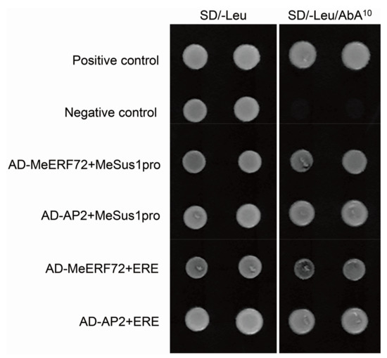 The full-length CDS of MeERF72 was cloned, and an AP2 DNA binding domain was found in the MeERF72 protein. Thus, two prey vectors, pGADT7-MeERF72 and pGADT7-AP2, were transformed into two bait strains Y1HGold/pSus1pro-AbA and Y1HGold/pERE1-AbA, respectively. The results showed that all four transformed yeast cells grew in the SD/-Trp/AbA10 medium, i.e., AP2 interacted with ERE1 (Figure 3), indicating that the MeERF72 protein can bind to the promoter of MeSus1 and the AP2 domain is indeed the DNA binding domain, and its accurate binding site may be the ERE (TTTGAAAT), which is located in the region from −1384 to −1376 bp of the MeSus1 promoter.