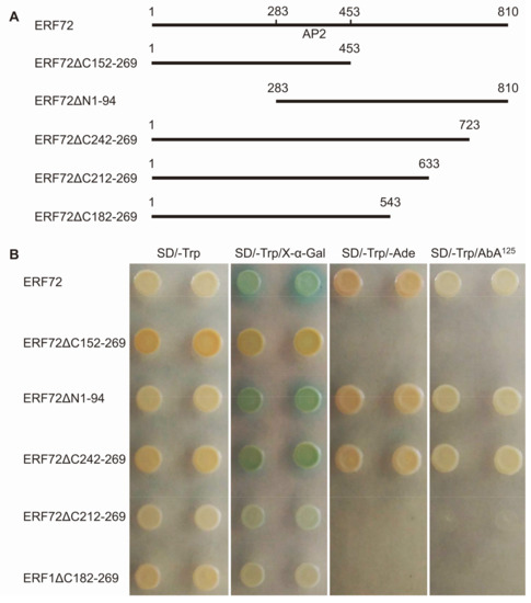 Region aa212-aa241 is the activated domain in MeERF72 protein. (A) Different deletion vectors of ERF72 protein: ERF72ΔC152-269 means that aa152 to aa269 is deleted from C-terminus, ERF72ΔN1-94 means that aa1-aa94 is deleted from N-terminus; (B) Activation of reporter genes by different deletions of ERF72 protein (SD/-Trp/AbA125 contains 125 ng/mL AbA).