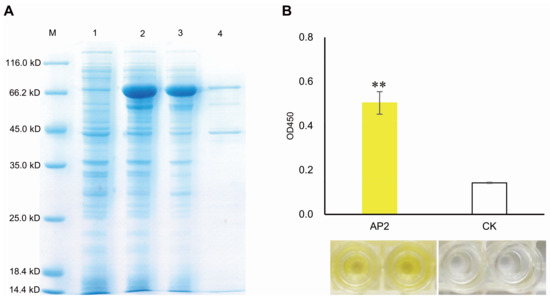 AP2 domain of MeERF72 binding to the promoter of MeSus1 as analyzed DPI-ELISA. (A) Over-expression of MeERF72 in E. coli. M: molecular markers, (1) E. coli cells harboring pCold Trigger Factor-AP2 not induced; (2) E. coli cells harboring pCold Trigger Factor-AP2 after 20 h of induction; (3) the clear supernate of total protein from E. coli cells harboring pCold Trigger Factor-AP2 after 20 h of induction; (4) Purified Trigger Factor-AP2 fusion protein; (B) AP2 interacts with the MeSus1 promoter by DPI-ELISA assay. AP2: double-strand biotinylated MeSus1 promoter DNA probe + purified Trigger Factor-AP2 fusion protein; CK: double-strand biotinylated MeSus1 promoter DNA probe + trigger factor. Error bars represent the SD of four technical replicates, the significant difference is assessed by ANOVA, ** p < 0.01.