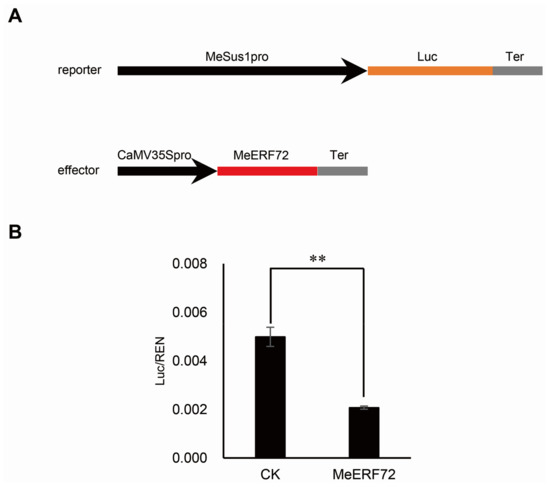 Repression of MeSus1 promoter in the transient expression system by MeERF72. (A) Reporter and effector vector sketches used in the transient expression assay; (B) Relative Luc activity of CK and MeERF72 in tobacco leaves. Error bars represent the SD of nine technical replicates, the significant difference is assessed by ANOVA, ** p < 0.01.