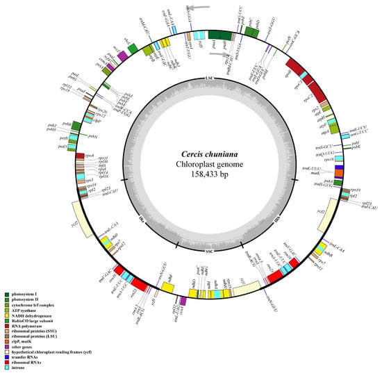 A total number of 2 × 250 bp pair-end reads of 1,917,920 were produced with 1.17 Gb of clean data. All reads data were deposited in the NCBI Sequence Read Archive (SRA) under accession number SRP118607. In total, 102 contigs (N50 = 8438 bp) were generated for C. chuniana. The size of the complete cp genome is 158,433 bp (Figure 1; Table 1). The cp genome displays a typical quadripartite structure, including a pair of IR regions (25,505 bp) separated by the LSC (88,063 bp) and SSC (19,360 bp) regions (Figure 1 and Table 1). The G + C content of the cp genome is 36.10% for C. chuniana, demonstrating congruence with that of C. canadensis (36.20%) (Table 1). When duplicated genes in the IR regions were counted only once, the cp genome of C. chuniana were found to encode 114 predicted functional genes, including 81 protein-coding genes (PCGs), 29 tRNA genes, and four rRNA genes, all of which are comparable to the numbers in C. canadensis and other related species (Table 1). The remaining non-coding regions include introns, intergenic spacers, and pseudogenes. Nineteen genes are duplicated in the IR regions, including eight PCGs, seven tRNA genes, and four rRNA genes (Figure 1 and Table S1). Fifteen genes (nine PCGs and six tRNA genes) contain one intron, and two PCGs (clpP and ycf3) have two introns each (Table S1). The maturase K (matK) gene in the cp genome is located within the trnK intron, consistent with the location in C. canadensis and similar to most other plant species [31]. In the IR regions of C. chuniana, the four rRNA genes and two tRNA genes (trnE and trnA) are clustered as 16S-trnE-trnA-23S-4.5S-5S. This differs from the cp genomes of C. canadensis and most legumes, which show a cluster of 16S-trnI-trnA-23S-4.5S-5S [32,33,34,35,36,37].