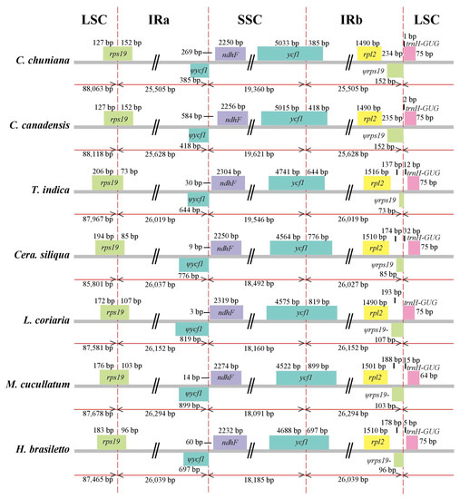 Pseudogenes are frequently identified in cp genomes [38,39]. Four pseudogenes were identified in the current study, i.e., Ψrps19, Ψycf1, ΨinfA and ΨaccD (Table 2). Ψrps19 and ycf1 are partially repeated in the IR regions and were generally found to be pseudogenized. The rps19 gene is 279 bp in all species (Figure 2) with length variation in the IR regions, from 73 bp in Tamarindus indica to 107 bp in Libidibia coriaria. It has the same length (152 bp) in both C. chuniana and C. canadensis in the IR regions (Figure 2). Because it is partially duplicated in the IR regions, the Ψrps19 gene has lost its protein-coding ability, thus producing the pseudogenized Ψrps19 gene. Two nonsynonymous substitutions were detected in the Ψrps19 gene between C. chuniana and C. canadensis. Among the seven species, 28 substitutions (seven in the IRb region and 21 in the LSC region, respectively) and 4 indels with length variation from 4 to 47 bp were identified (Figure 2; Table 2). The same was found with the Ψycf1 gene, as the IRb/SSC junction region is located within the Ψycf1 CDS region and only a partial gene is duplicated in the IRa region, thus producing the pseudogene Ψycf1. This is generally the case in the dicots. The length of the Ψycf1 pseudogene in the IR regions ranges from 385 bp in C. chuniana to 899 bp in Mezoneruon cucullatum. Four nonsynonymous substitutions were detected between C. chuniana and C. canadensis. Altogether 20 substitutions (19 in the IRa region and one in the SSC region) and 7 indels with length variation ranging from 1 to 33 bp are present among the seven species (Figure 2; Table 2). The ΨinfA gene is pseudogenized in all species except Ceratonia siliqua, with a length of 135 bp in both C. chuniana and C. canadensis and with length ranging from 192 to 252 bp among the other four species. A total of 23 substitutions and 6 indels ranging from 1 to 13 bp in length occurs in ΨinfA (Figure 2; Table 2). The pseudogenized ΨinfA gene has also been frequently found in other angiosperm chloroplast genomes as well [40,41,42]. The pseudogenized ΨaccD gene is present in all species except T. indica and M. cucullatum, with a length of 1473 bp in both C. chuniana and C. canadensis and with length ranging from 1395 to 1500 bp in the other three species. Six indels ranging from 3 to 36 bp in length, and 101 substitutions were detected in ΨaccD (Table 2).