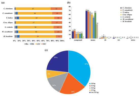 Analysis of repeated sequences of the seven species compared in this study. (a) The number of SSRs distributed in different regions; (b) The number of SSRs with different types, including compound, mono-, di-, tri-, and tetranucleotides; (c) The proportion of SSRs with different lengths.