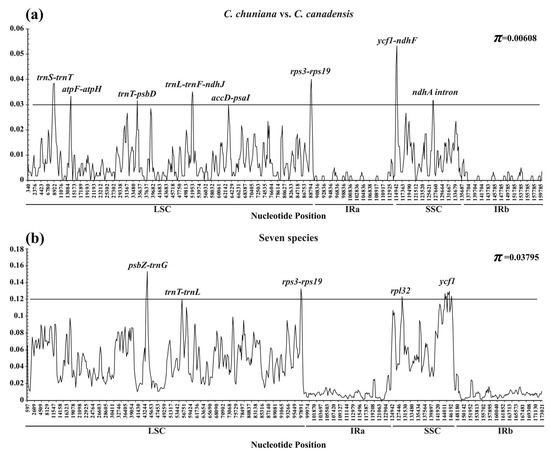 Sliding window analysis of the whole cp genome. (a) C. chuniana and C. canadensis; (b) All seven species. X-axis: position of the midpoint of a window; Y-axis: nucleotide diversity (π) of each window.