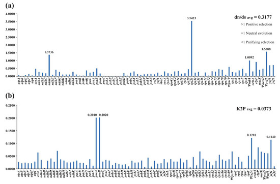 Evolutionary dynamics of genes in the cp genomes. (a) The dn/ds ratios for individual genes; (b) The K2P values for individual genes.