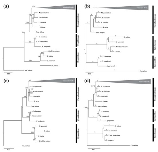 A total of 97 representative species from the old Caesalpinioideae and Mimosoideae were selected to reconstruct phylogenetic relationships (Table S4). Cucumis sativus (DQ119058) was used as the outgroup. Two phylogenetic methods of Bayesian inference (BI) and maximum likelihood (ML) resulted in highly similar phylogenetic trees based on the complete cp genome sequences and 61 protein-coding genes (PCGs) (Figure 6). The total aligned length was 302,882 bp for the complete cp genome sequences and 69,253 bp for the PCGs, and the number of parsimony-informative sites was 163,470 bp and 25,698 bp, respectively. The trees based on ML exhibit completely congruent topologies with higher bootstrap support values in the tree based on complete cp genome sequences than those based on the PCGs (Figure 6a). The relationship between subfamilies Cercidoideae and Detarioideae was not stable in the BI analysis, but otherwise high posterior probability values were detected in both the ML and BI analyses based on the two data sets (Figure 6b). All analyses recover the monophyly of both the Cercidoideae and Detarioideae with strong support. Our results are consistent with [50] and strongly support the new classification system of the Fabaceae [21].