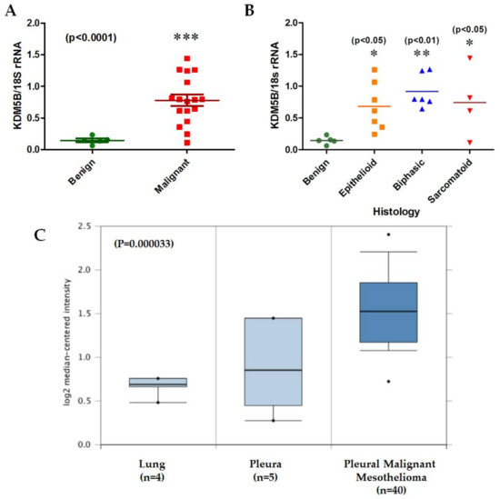 Preliminary data from our group indicates that expression of KDM5B is significantly upregulated in primary MPM (Figure 2A), remaining significant across all histological subtypes (Figure 2B). Similar significant overexpression of KDM5B is also observed in MPM samples in the Gordon et al. [52] mesothelioma dataset (Figure 2C). Across the TCGA dataset, KDM5B appears to have significant alterations in about 14% of MPM cases, including amplification of its genomic region, overexpression, or indeed downregulation of its mRNA (Figure 2D), all of which are found in either the epithelioid or biphasic subtypes (Figure 2E).