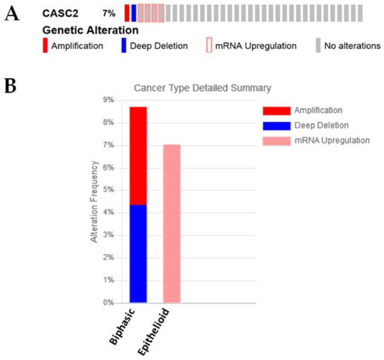 A functional role for this lncRNA in MPM has not yet been identified. However, it was observed to be significantly downregulated in the sarcomatoid compared to the epithelioid subgroup (Table 1) [27]. cBioPortal analysis of the current TCGA mesothelioma dataset finds that 7% of samples have either amplifications or deletions in HULC, or overexpress this lncRNA (Figure 10A). When separated according to histology, the majority of alterations observed were found to be of the biphasic subtype (Figure 10B).