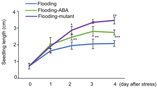 Seedling length of wild-type soybean, abscisic acid (ABA)-treated soybean, and flood-tolerant mutant soybean plants under flooding. Two-day-old wild-type soybean and flood-tolerant mutant soybean plants were exposed to flooding. For ABA treatment, 10 μM ABA was supplied to wild-type soybean plants exposed to flooding at the same time. The seedling length, which is the length of root including the hypocotyl, was measured at each time point. Data are mean ± standard deviation (SD) from three independent biological replications. Flooded wild-type soybean plants at each time point were used for comparison. * p < 0.05, ** p < 0.01, and *** p < 0.001 (Student’s t-test).