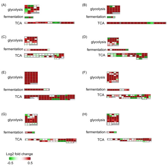 Abundance of proteins mapped to glycolysis, fermentation, and tricarboxylic acid cycle in soybean plants. (A) Four-day-old wild-type soybean without flooding stress. (B) Six-day-old wild-type soybean without flooding stress. (C) Four-day-old wild-type soybean flooded for two days. (D) Six-day-old wild-type soybean flooded for four days. (E) Four-day-old wild-type soybean flooded for two days coupled with ABA treatment. (F) Six-day-old wild-type soybean flooded for four days coupled with ABA treatment. (G) Four-day-old flooding-tolerant soybean flooded for two days. (H) Six-day-old flooding-tolerant soybean flooded for four days. Two-day-old wild-type soybean plants were treated without or with flooding for two and four days. For ABA treatment, 10 μM ABA was supplied to wild-type soybean plants exposed to flooding at the same time. Two-day-old flood-tolerant mutant plants were exposed to flooding for two and four days. Unstressed wild-type soybean plants served as control. Green and red colors indicate a decrease and increase, respectively, in fold change values compared with two-day-old unstressed wild-type soybean plants. Abbreviation: TCA, tricarboxylic acid cycle.