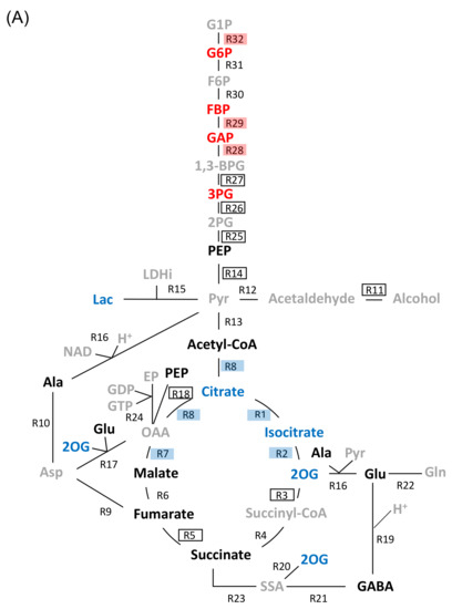 Glycolysis, fermentation, and tricarboxylic acid cycle were predominantly affected by flooding conditions in the soybeans (Figure 2). Proteins related to these metabolisms were divided into 15 biochemical reactions (Table 1 and Table 2) based on the model constructed by Sakata et al. [20]. It indicated that eight, one, and six biochemical reaction(s) were presented in glycolysis, fermentation, and tricarboxylic acid cycle, respectively (Figure 3A). Calculation for 15 enzyme reactions was conducted and, after adjusting the Vmax values of these proteins, simulated amounts of 16 target-fitting metabolites (Figure 3B) were fitted to the experimental metabolic data of flooded soybeans reported by Nakamura et al. [21]. The log-transformed calculated data and experimental data of the target-fitting metabolites were plotted against each other (Figure S5).