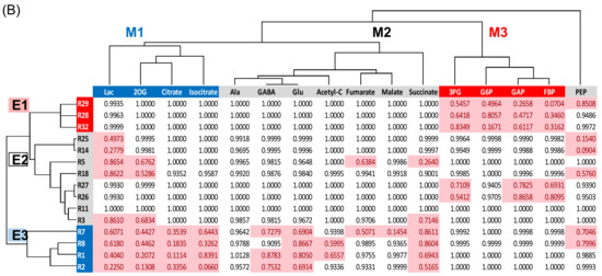 Soybean metabolic model and genetic modification effectiveness analysis. (A) Schematic diagram of soybean metabolic model. “Rx” indicates reaction number (Table S5). Sixteen target-fitting metabolites presented with blue, black, and red colors indicate the metabolites in M1, M2, or M3 groups, respectively. Metabolites presented with gray color are included in model but not target-fitting metabolites. The “Rx” circled with red, black, and blue colors indicate the enzymes in E1, E2, and E3 groups, respectively. (B) Result of genetic modification effectiveness analysis. Clustering was conducted on the basis of metabolite accumulation reduction ratio. “E” and “M” indicate the enzyme and metabolite, respectively. Tabulated reduction ratios were subjected to hierarchical clustering analysis, which was a centroid linkage method based on a Euclidean distance metric. Metabolites presented with blue, gray, and red colors are those divided into M1, M2, and M3 groups, respectively. Red cell in the table indicates accumulation reduction ratio, which was lower than 0.9 for corresponding enzyme modification-metabolite pair. Abbreviations are as follows: 1,3-BPG, 1,3-bisphosphoglyceric acid; 2OG, 2-oxoglutarate; 2PG, 2-phosphoglyceric acid; 3PG, 3-phosphoglyceric acid; Acetyl-CoA, acetyl-coenzyme A; Ala, alanine; Asp, aspartic acid; EP, enolpyruvate; F6P, fructose 6-phosphate; FBP, fructose bisphosphate; G1P, glucose-1-phosphate; G6P, glucose 6-phosphate; GABA, gamma-aminobutyric acid; GAP, glyceraldehyde-3-phosphate; GDP, guanosine 5’-diphosphate; Gln, glutamine; Glu, glutamate; GTP, guanosine 5’-triphosphate; Lac, lactate; LDHi, lactate dehydrogenase inhibitor; NAD, nicotinamide adenine dinucleotide; OAA, oxaloacetate; PEP, phosphoenol pyruvate; Pyr, pyruvate; SSA, succinic semialdehyde.