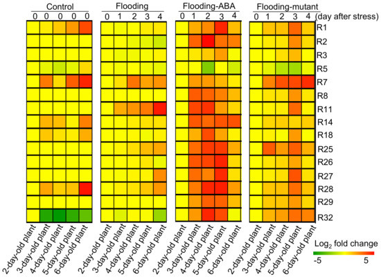 The flood-tolerant soybean, which was generated using gamma-ray irradiation and coupled with flood-tolerant tests, survived after seven days of stress and its root tip was not affected by flooding conditions [13]. When exposed to flooding, the survival ratio of a soybean was improved when plant growth was controlled by additional abscisic acid (ABA) treatment. The sugar metabolism of the soybean also contributed to flood tolerance via the regulation of zinc finger proteins, cell division cycle 5 protein, and transducin, which were induced by ABA [14]. Subsequently, it was determined that the metabolic processes of protein synthesis and RNA regulation contributed to triggering tolerance to initial flooding stress in the flood-tolerant soybean and ABA-treated plant; concurrently, the integrity of cell wall and balance of glycolysis were key factors for the survival stages [15]. These results support the conclusion that ABA treatment to flooded soybeans exhibited tolerant characteristics such as an increased survival ratio; it also suggests that the flooded soybean with ABA treatment as well as the flood-tolerant soybean could provide the materials to investigate flood tolerance mechanisms of the soybean.
