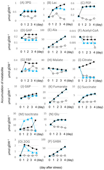 Temporal profiles of 16 metabolites for unstressed and flooding conditions with and without enzyme modification: (A) 3PG; (B) Lac; (C) PEP; (D) GAP; (E) Ala; (F) Acetyl-CoA; (G) FBP; (H) malate; (I) citrate; (J) G6P; (K) fumarate; (L) succinate; (M) isocitrate; (N) Glu; (O) 2OG; (P) GABA. In the enzyme modification, overexpression was mimicked by increasing for R1, R28, and R3, 3.2, 1.8, and 1.6×, respectively, the Vmax value from its initial value (Table S5). Filled circle and blue triangle indicate simulated profiles under flooding without and with enzyme modification, respectively. Open circle indicates experimental profiles in unstressed conditions. The area below each temporal profile under flooding without and with enzyme modification was measured and was used to calculate metabolite accumulation reduction ratio. Horizontal and vertical axes indicate day-after stress and accumulation of metabolite, respectively. “DW” indicates dry weight of plant. The abbreviations of metabolites are the same as described in the legend of Figure 3.
