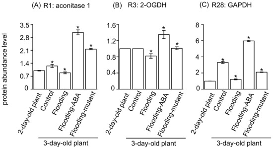 Protein abundance of aconitase 1,2-oxoglutarate dehydrogenase, and glyceraldehyde-3-phosphate dehydrogenase in soybean at an early stage of flooding. (A) Protein abundance of aconitase 1 (R1) in soybean at an early stage of flooding; (B) Protein abundance of 2-oxoglutarate dehydrogenase (R3) in soybean at an early stage of flooding; (C) Protein abundance of glyceraldehyde-3-phosphate dehydrogenase (R28) in soybean at an early stage of flooding. Two-day-old wild-type soybean plants were treated without or with flooding for one day. For ABA treatment, 10 μM ABA was supplied to wild-type soybeans exposed to flooding at the same time. Two-day-old flood-tolerant mutant plants were exposed to flooding for one day. Unstressed wild-type soybean plants served as controls. Root samples (including the hypocotyl) were collected for protein extraction. SIEVE analysis was performed to examine protein abundance. Data shown are means ± SD from three independent biological replications. Two-day-old unstressed wild-type soybean plants were used for comparison. * p < 0.05 (Student’s t-test). Abbreviations are as follows: 2-OGDH, 2-oxoglutarate dehydrogenase; GAPDH, glyceraldehyde-3-phosphate dehydrogenase.
