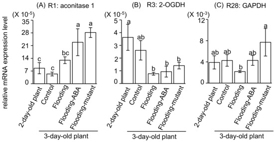 Gene expression of aconitase 1,2-oxoglutarate dehydrogenase, and glyceraldehyde-3-phosphate dehydrogenase in soybean at an early stage of flooding. (A) Gene expression of aconitase 1 (R1) in soybean at an early stage of flooding; (B) Gene expression of 2-oxoglutarate dehydrogenase (R3) in soybean at an early stage of flooding; (C) Gene expression of glyceraldehyde-3-phosphate dehydrogenase (R28) in soybean at an early stage of flooding. Two-day-old wild-type soybean plants were treated without or with flooding for one day. For ABA treatment, 10 μM ABA was supplied to wild-type soybean exposed to flooding at the same time. Two-day-old flood-tolerant mutant plants were exposed to flooding for one day. Unstressed wild-type soybean plants served as controls. Root samples (including the hypocotyl) were collected for mRNA extraction. qRT-PCR was performed and gene expression was normalized against 18S rRNA. Data shown are means ± SD from three independent biological replications. Different letters indicate statistically significant difference (p < 0.05, one-way ANOVA followed by Tukey’s multiple comparison test). Abbreviations are as follows: 2-OGDH, 2-oxoglutarate dehydrogenase; GAPDH, glyceraldehyde-3-phosphate dehydrogenase.
