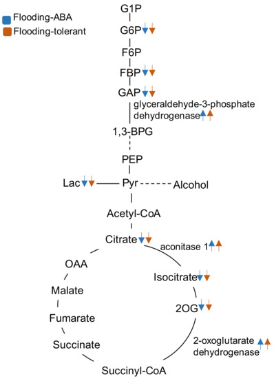 Accumulation of pyruvate was increased in flooded soybeans [21] and activation of fermentation was an important factor for acquisition of flood tolerance [13]. In this study, tricarboxylic acid cycle was another metabolic process which was markedly suppressed in wild-type soybean while slightly inhibited in flood-tolerant materials in response to flooding conditions (Figure 2). Modifications of enzymes, including aconitase 1 and 2-oxoglutarate dehydrogenase, were effective to decrease metabolite accumulation in flooded soybeans (Figure 3 and Figure 5).